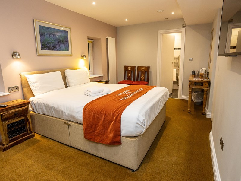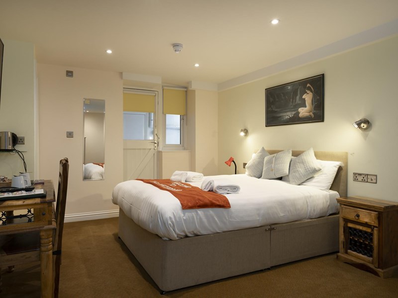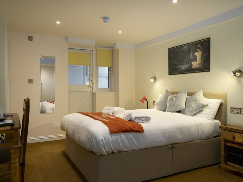This generous double room is located on the lower ground level, featuring windows that allow natural light to brighten the space. Accessible via stairs or lift, it includes an en suite bathroom with a shower, toiletries, complimentary Wi-Fi, tea and coffee making facilities, a large LED TV, an iron and ironing board, and a hair dryer. Due to its location, the room is priced more affordably, though it may experience some overhead noise. Complimentary ear plugs are provided, but these rooms might not be ideal for light sleepers.
